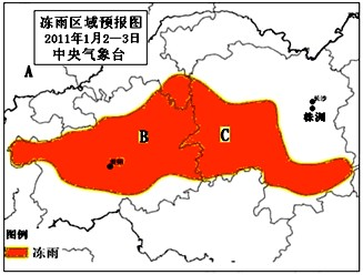【小题1】根据图中地理位置判断:冻雨主要分布的省级行政区简称是B黔或贵、C湘。
