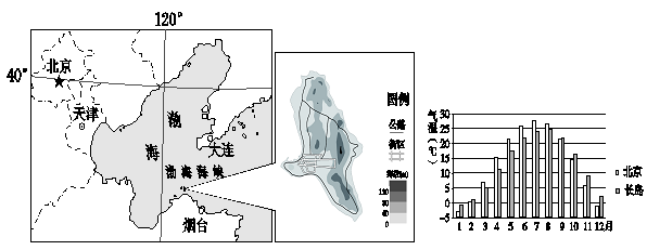 3、综合题 如图所示长岛(南岛)位于渤海海峡,地处渤海、黄海分界线。图为北京和长岛气温统计图。读图,回答下列问题。