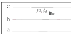 4、单选题 图为“某处等压线水平分布图”,气压值a<b<c,风向平行于等压线,读图回答下题。