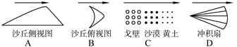 本题解析:沙丘的迎风坡一侧为缓坡,俯视图上应向外凸出,而背风坡为陡坡,且向内凹,故图示B图错误。风力沉积物分布特征,随风力的递减,颗粒物由粗到细沉积;河流在出山口由上而下形成扇状沉积。