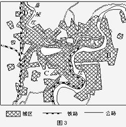 小题4:读图3,重庆市城区布局的特点是?。其中心商务区可能位于A~D中的?处,判断的依据是?