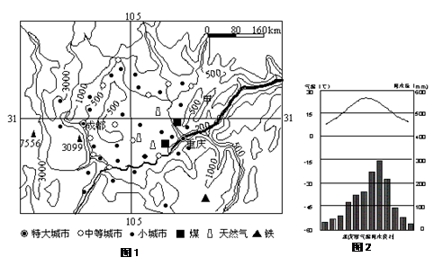 小题2:结合图2,最低月温为0°C以上,降水集中在夏季,故判断为亚热带季风气候。由于位于四川盆地,冬季北部山地阻挡了北方冷空气;