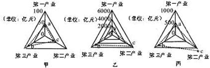 4、单选题 甲、乙、丙代表三省区2006年国民生产总值及其构成,下图中a、b、c分别为三大产业的产值,据图判断两题。