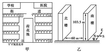 材料一 甲图是我国某小区平面图,乙图是该小区中相邻两栋住宅楼分布示意图。