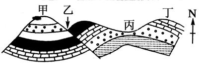 【小题2】图中丙是背斜,甲是向斜,乙是断层,丁是背斜单翼;背斜构造利于储存石油和天然气;向斜构造利于地下水的储存;断层处有利于泉水出露。选C正确。