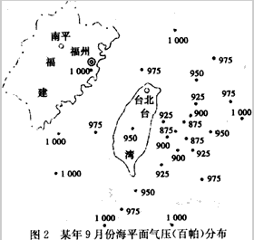(3)在图2中画出875、900、925、950百帕四条等压线,并判断该图所示天气系统的类型。