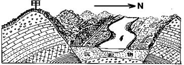 本题解析:试题分析:1.从图中岩层的分布可以看出岩层断裂并发生错位,因此为断层地质构造,根据同一岩层的分布位置可以得出甲处岩层上升,形成断块山;中部河流处岩层下陷,河流携带泥沙沉积形成河谷地形。
