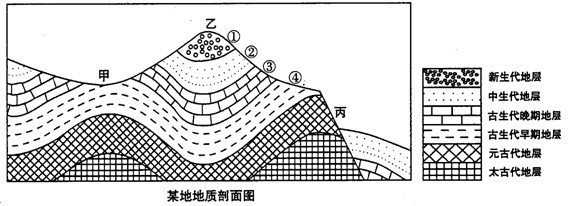 (2)丙;甲处地质构造为背斜,该处容易形成断裂,岩石比较破碎,因此更容易受到流水侵蚀作用,地势逐渐降低,而形成山谷