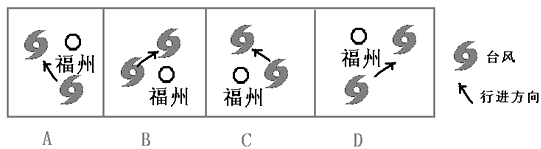 【小题2】台风“麦德姆”登陆期间,福州市气象台观测,7月23日17:00 — 23:30该市风向由东北风转为东南风。下列表示该时段台风中心与福州相对位置及行进方向正确的是( )