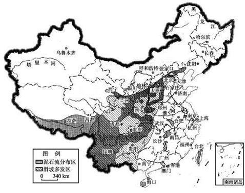 材料二:图为“中国滑坡和泥石流灾害的主要分布图”。
