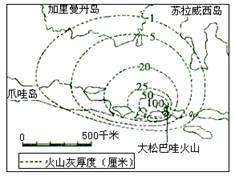 4、单选题 下图表示1816年印度尼西亚大松巴哇火山爆发后火山灰厚度的分布。读图回答(1)-(3)题。