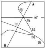1、综合题 读某区域图,AB为晨昏线,甲地常年受西风带影响,此时甲地刚好看到日落,流经甲地的河流注入某大洋。回答下列问题。(16分)
