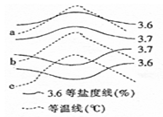 本题解析:1.本题考查世界海水温度和盐度的分布规律及影响因素。根据等温线的弯曲判读洋流流向为自南向北,根据海水等盐度线分布,3.7%附近应为副热带海区,根据等盐度线弯曲情况考虑,中央盐度高于同纬度地区,所以可以判断在30°附近有暖流经过,而且流向是自南向北,所以该区域位于北半球,所以选择C选项c>b>a。