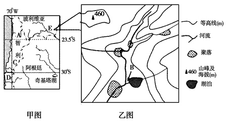 1、单选题  下图中甲图为南美洲局部地区图,乙图为甲图中E地区的地形图。读图回答下列小题。