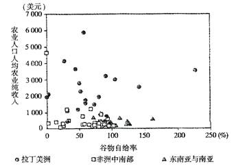 3、单选题 2011年世界银行表示,7月份全球粮食价格接近三年来最高位,且库存较低,这令世界贫困人口面临更大压力。下图表示拉丁美洲、东南亚与南亚、非洲中南部部分国家农业人口的人均农业纯收入和谷物的自给状况。据此完成下列小题。