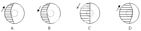 4、填空题  下图中的四幅图表示地球相同季节的昼夜情况,图中小圆表示极圈,阴影部分表示黑夜,箭头表示地球自转方向,其中日期相同的两幅是