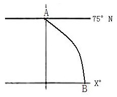 5、单选题  弧线AB为晨昏线的一段,A是晨昏线与75°N的切点,B是晨昏线与北纬X°的交点,该日X°纬线圈的昼弧和夜弧之比为5:7,B点太阳高度角最大时国际标准时间是9时,据此完成小题。
