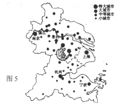 3、单选题 读图5“2000年长江三角洲地区城市分布图”,完成问题。