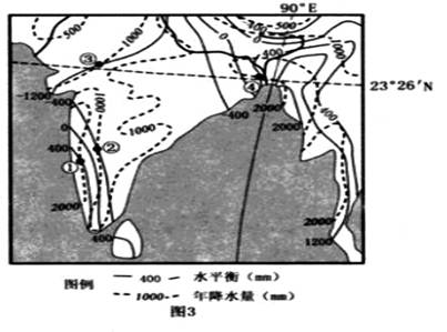 1、单选题  水平衡(年降水量减去年蒸发量)反映某地区水分的盈亏。图3为世界某区域地图。读图回答问题。