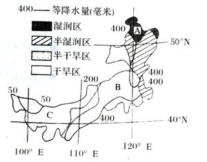 (2)该地区年降水量由_________向________递减,我们根据降水量和蒸发量的对应关系,将其划分为四个不同的干湿地区。