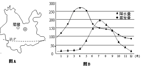 3、单选题 干旱是我国普遍存在的气象灾害。图A是我国某省区轮廓图,图B是楚雄常年逐月降水量与蒸发量对比图。读图回答下题。