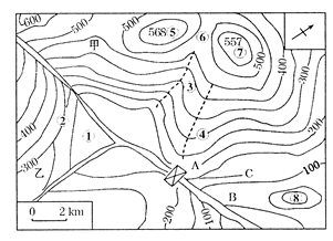 1、单选题 某校研究性学习小组到野外考察。如图为考察区域地形图,虚线所示为考察线路。读图,回答下题。