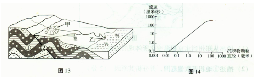 5、综合题  (8分)图13力地质构造示意图,图14为河流沉积与流速的关系图。据图回答下列问题。