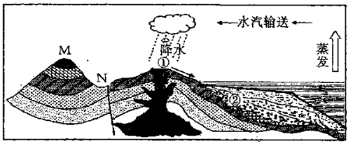 (2)根据水循环发生的领域,图中所示水循环为?循环,在该水循环参与下,①处的?岩浆岩可转化为②处的?岩。