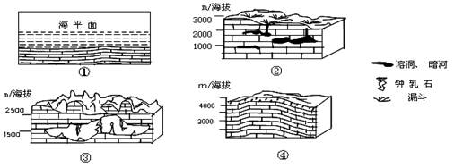 4、单选题 国土资源部2012年4月28日发布全国土地石漠化报告显示,我国石漠化的总面积达到了11.35万平方公里,每年因为石漠化损失的耕地面积为30万亩。石漠化是在喀斯特地貌基础上形成的一种荒漠化的现象,简单来说就是土地逐渐被石头占据,90%的石漠化地区集中在云贵高原地区。下图为云贵高原形成与发育过程示意图,读图回答下题。