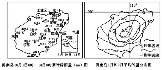 材料一:气象资料显示,海南省东部常年10月份平均降水量可以达到300毫米以上,西部地区大约为100~200毫米之间,2010年10月,海南岛东部不到半月的降水量就达到平均水平的3-5倍,确实让人震惊!再加上下半月的降雨,那就可能达到平均水平的4-7倍。今年海南岛的10月还真的是"暴雨惊魂"!下图为海南降雨和气温分布图。