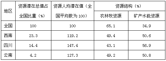 3、单选题 读“西南地区主要自然资源潜在价值(统计数未包括西藏)统计表”,回答1—2题。