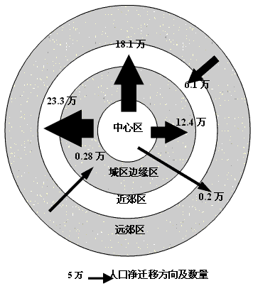 1、单选题 读“2005年我国东部沿海某市各圈层间人口净迁移模式图”,完成1—2题。