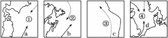 1.四幅图中数码所代表的渔场名称与图序一致的是2.四幅图中字母所代表的洋流名称与图序一致的是3.渔场多分布在寒暖流交汇处的主要原因是