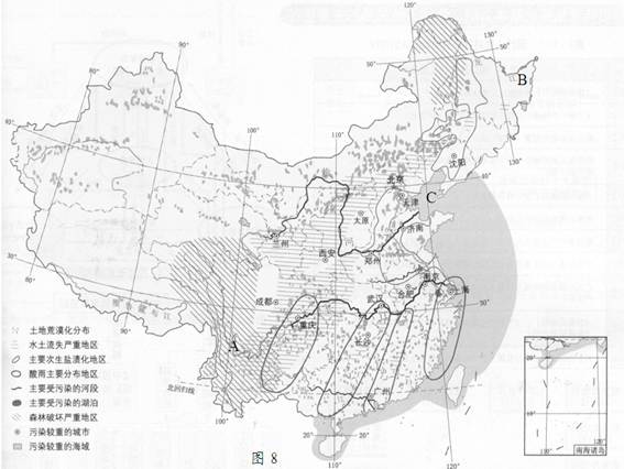 2、综合题  图8为“中国环境问题分布图”,读图完成下列各题。(17分)