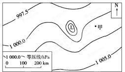 【小题1】该题主要考查等压线的判读。甲地位于低压中心东侧,可在图中甲点附近直接做经过甲的水平气压梯度力,我国某地为北半球,地转偏向力向右偏,风向相对水平气压梯度力向右偏大约30°-40°,为偏南风,故选B。