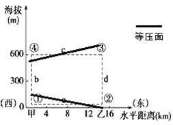 【小题1】从图B中可知,甲处近地面与600米高空垂直气压差大于乙处,也即①和④处的气压差大于②和③处的气压差,近地面①②处的气压总比600米高空③④处的气压高,当“高者更高,低者更低”就会造成近地面和相对应的高空垂直气压差增大,所以可以得出近地面气压①>②,600米高空③>④,近地面和高空等压面分布如下图所示。