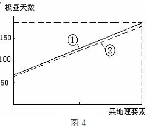 1、单选题 图4是极地附近极昼天数随某地理要素变化图。据此回答6-7题。