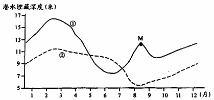 2.各地不同月份降水量的差异导致该地潜水的埋藏深度,降水越多,潜水的埋藏深度越浅。据上题可知图中①地为江南丘陵,2月潜水的埋藏深度最深,降水最少,6月潜水的埋藏深度最浅,降水最多,8月潜水的埋藏深度又变深,可见该地8月降水也变少了,这样的情况符合江南丘陵,2月雨带未到达,降水少,6月正值梅雨,降水多,8月副高控制,降水再次变少。图中M处确好位于①地的8月份,即为江南丘陵的8月,受副热带高压控制,降水少,潜水的埋藏较深。