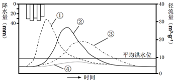 本题解析:(1)人类活动影响下形成的洪水过程线包括城市化后的洪水过程线和修建水库后的洪水过程线,①曲线洪峰出现最早最高,是城市化后的洪水过程线,③曲线洪峰出现最迟最低,是修建水库后的洪水过程线。