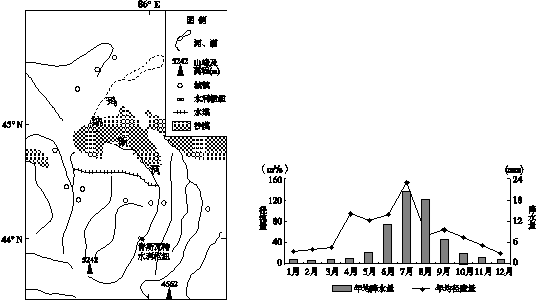 1、单选题 下图是新疆玛纳斯河流域图及该流域年均径流量与降水量统计图。读图,回答下列问题。