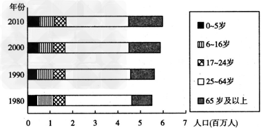 4、单选题 2001—2020年我国进入快速老龄化阶段。在这20年里,我国平均每年将增加596万老年人口,年均增长速度达到3.28%,大大超过总人口年均0.66%的增长速度。到2020年,老年人口将达到2.48亿,老龄化水平将达到17.17%,其中,80岁及以上老年人口将达到3 067万,占老年人口的12.37%。据此完成(1)-- (2)题。