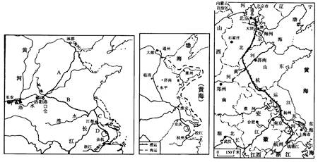 1、综合题 读三幅不同时期的京杭大运河图,并回答下列问题: