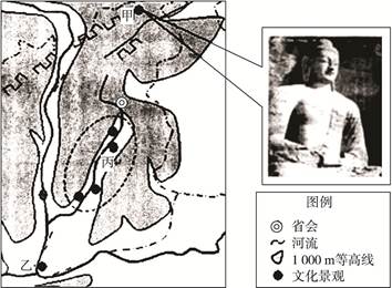 小题1:图示地区历史悠久,文化景观众多,旅游资源丰富。图中丙区域文化景区的地域形态呈条带状分布的自然条件是