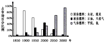 (1)从材料一可知:全球能源消费中,从1950年~2050年是_______占市场份额较高的百年;据图回答,