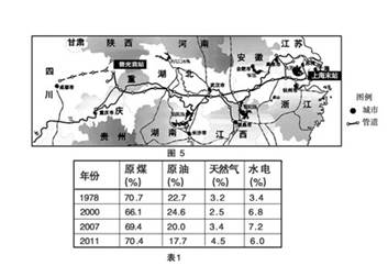 4、单选题 川气东送(下图)被列为继三峡工程、西气东输、青藏铁路、南水北调之后的中国第五大工程,该工程西起四川普光气田,东至上海市。表1为我国能源消费结构(%)表。据此回答问题。