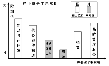 材料三:近年来世界上多个发达国家在东南亚的印度尼西亚、菲律宾等国建立工业生产基地,其产业链环节上的分工情况如下图所示。