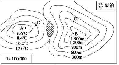 图中左侧区域等温线的海拔高度分别是300m、600m、900m、1200m,故A点海拔是1200m<H<1500m