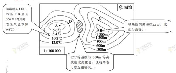 右侧的等高线转换成等温线分别是12.0℃、10.2℃、8.4℃、6.6℃、4.8℃,从而判断出B点的温度是3℃<T<4.8℃。C地与湖泊之间为一山脊,无法看到湖泊美景。B处为山谷,地表水可以流入湖泊。
