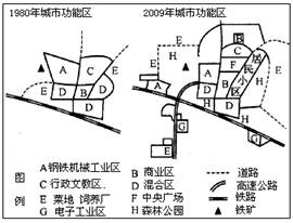 2、综合题 下图为我国华北地区某城市1980年和2009年城市功能区分布图.比较两幅图,回答有关问题。