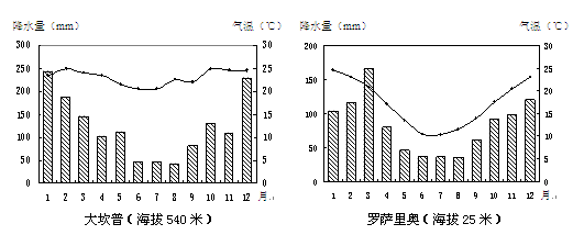 材料二:大坎普、罗萨里奥气温曲线和降水柱状统计图。